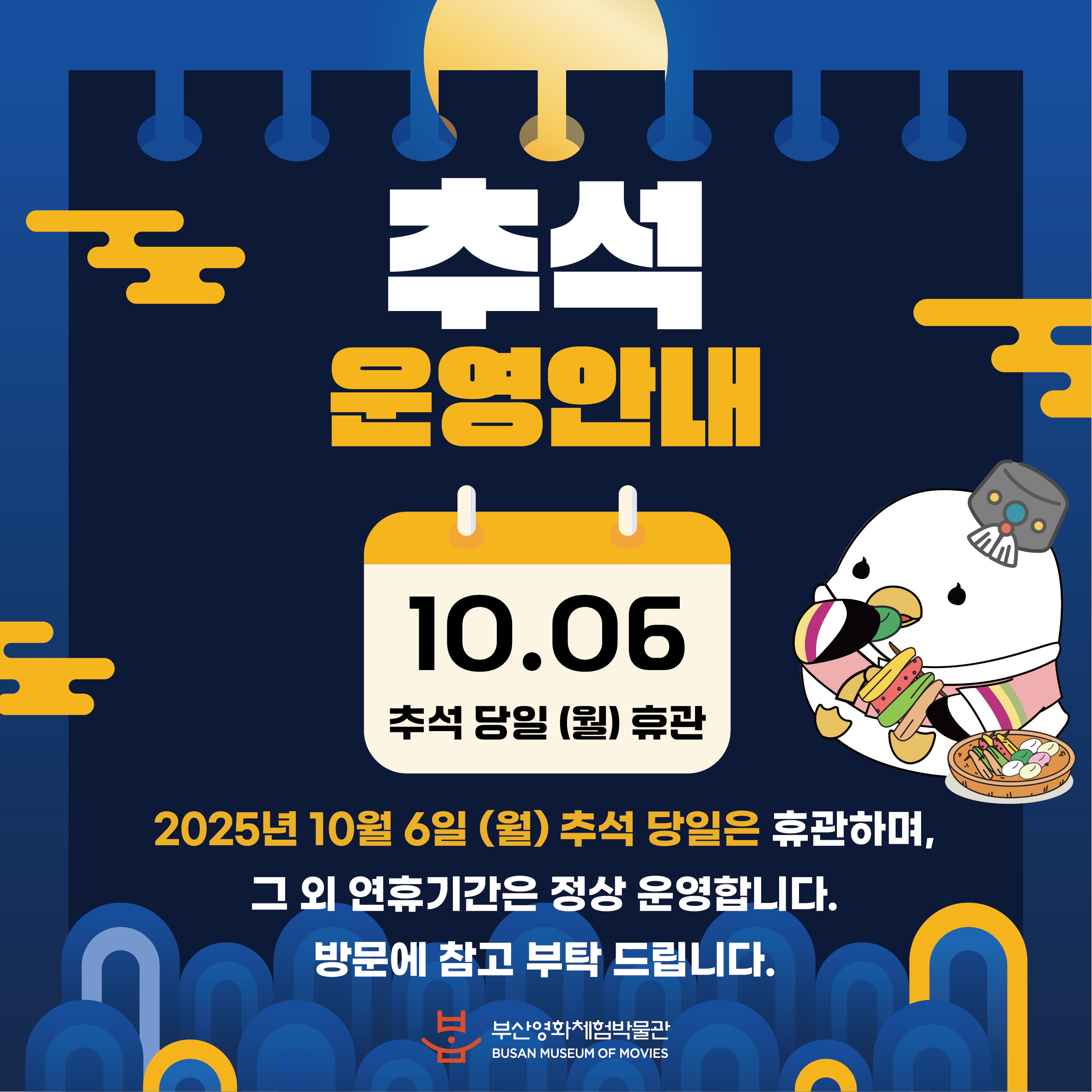 매주 월요일(단, 공휴일과 겹치는 경우 그 다음 날), 1월 1일, 설날, 추석 당일